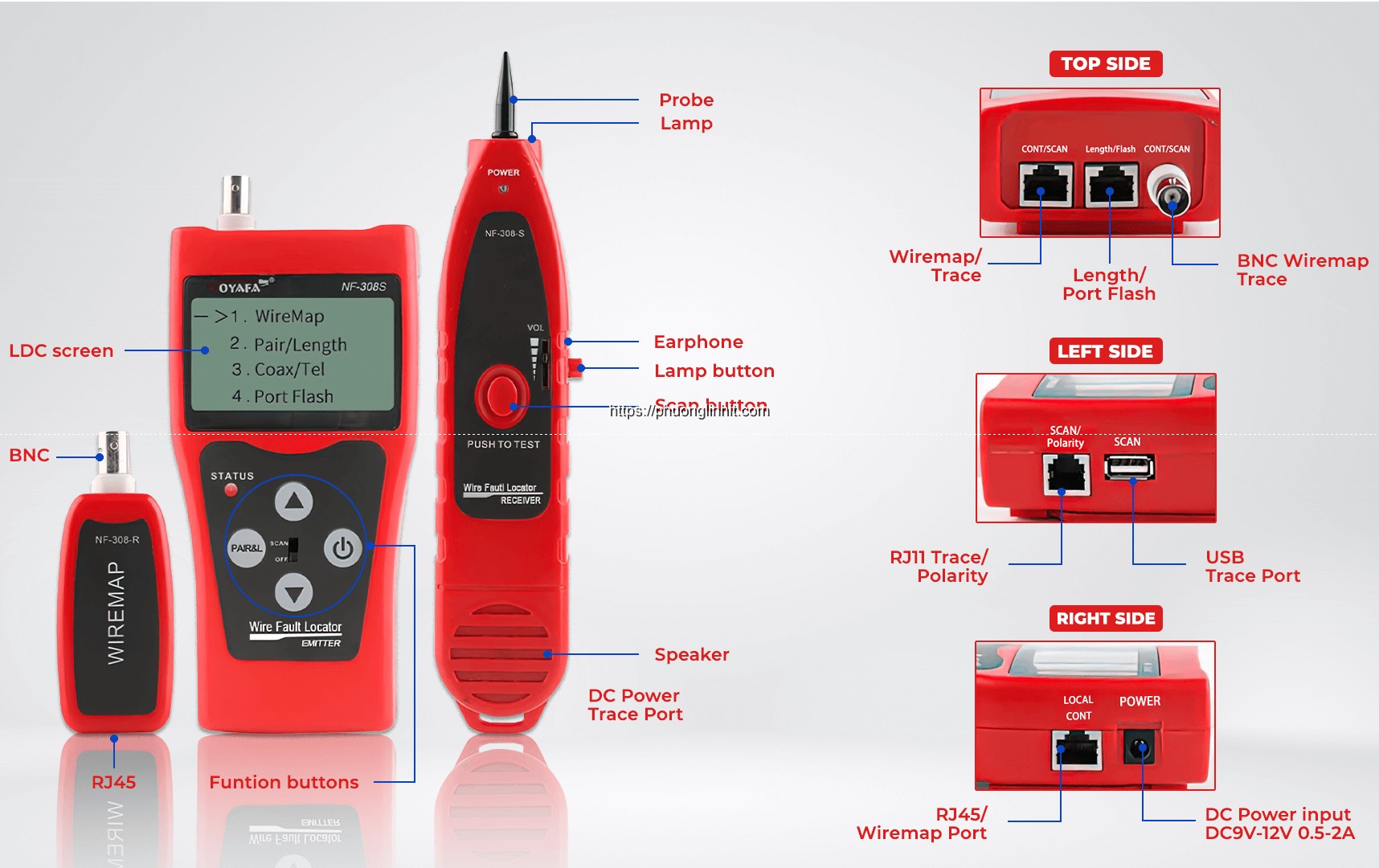 Máy test mạng Noyafa NF-308S là công cụ đa năng giúp kiểm tra và định vị dây cáp mạng, điện thoại và cáp đồng trục. Thiết bị có thể đo chiều dài dây cáp và khoảng cách đến điểm lỗi (đứt, hỏng) trên dây, kiểm tra sơ đồ chân dây (đối với cáp mạng RJ45), định vị cổng mạng mong muốn trên thiết bị switch/ router, và thậm chí còn theo dõi dây cáp nằm âm tường. Bên cạnh đó, NF-308S còn có khả năng đo cực tính và điện áp DC trên dây.